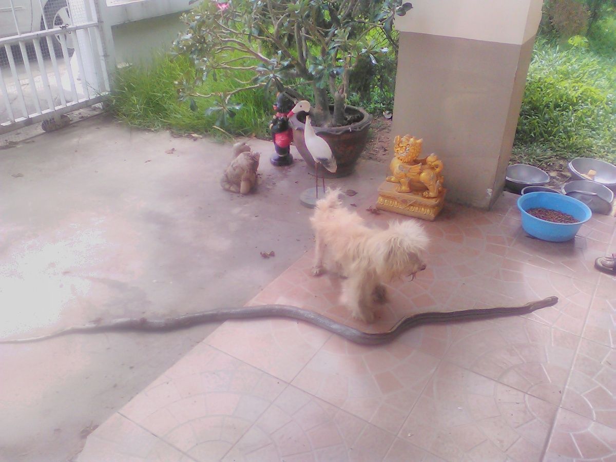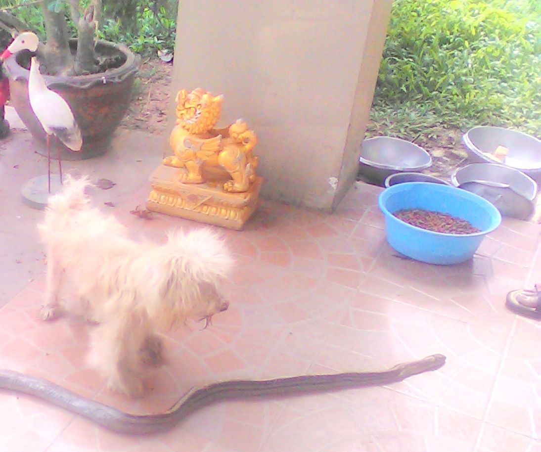 Les chiens n'ont pas apprécié et en quelques minutes le sort du serpent à été réglé. Le plus petit des chiens et le plus vieux : tching chang n'a pas été le denier à lui sauté dessus